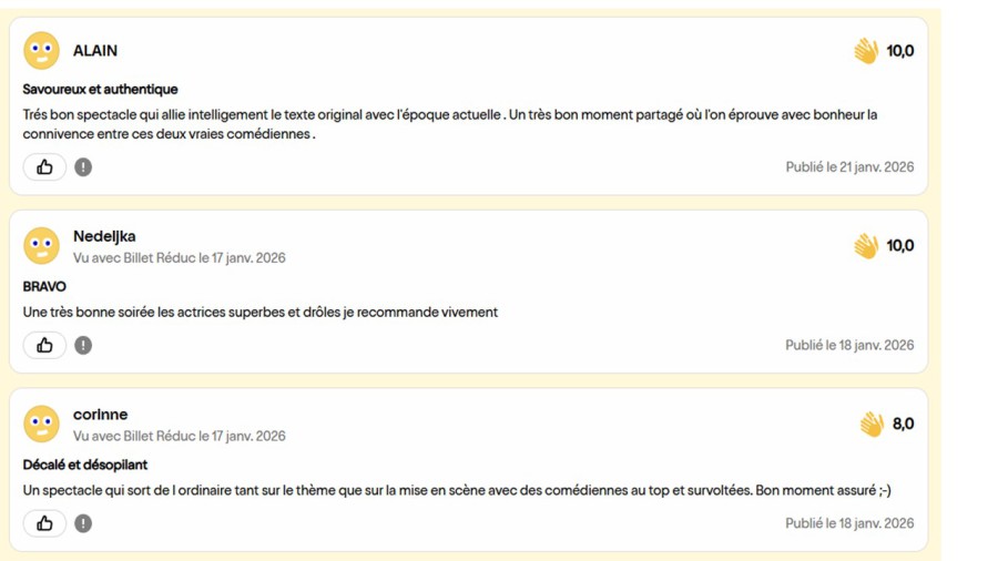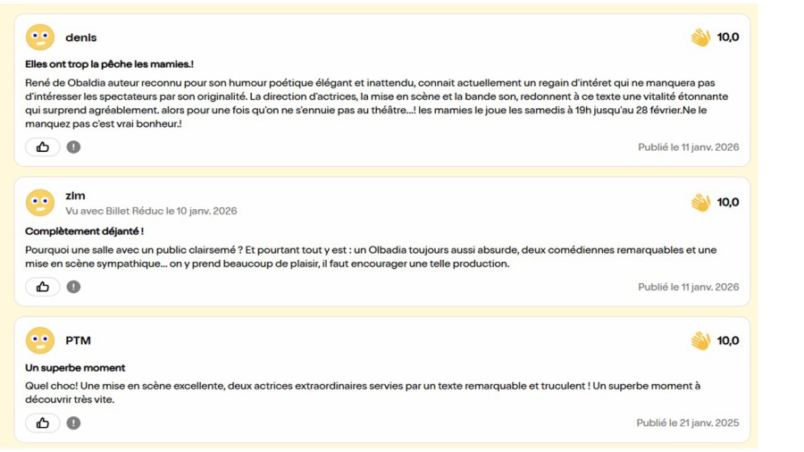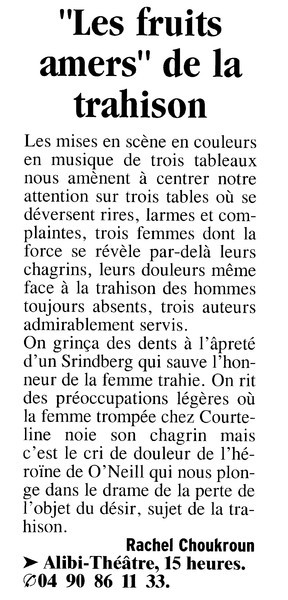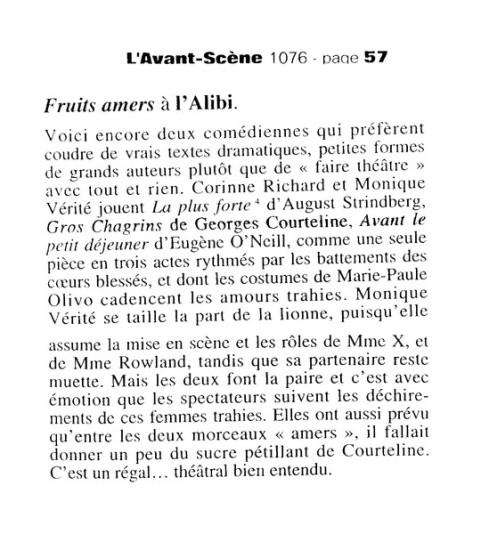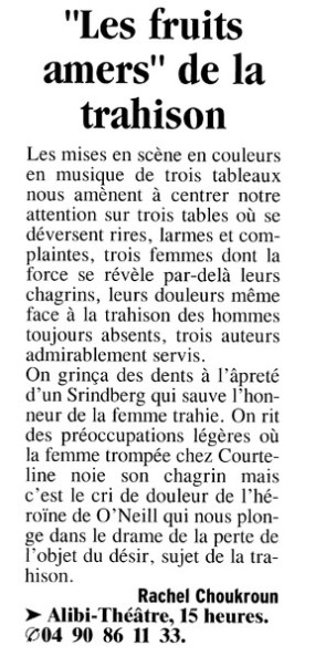 Les comédiens se sont accaparé ce texte avec beaucoup de bonheur. On découvrira une des premières prestations sur scène de Tatyana Alcide, aussi décalée que Christian Vurpillot qui a bien saisi son personnage plus gauche que bonimenteur loin des miasmes de tous et des plaintes affectives de Pierre (Thierry Brault) ou des émotions de Paul (Bruno Richy ou Gilles Pernet) autour de deux femmes touchantes (Monique Vérité et Corinne Richard) qui s'épient et ne se pardonneront rien.