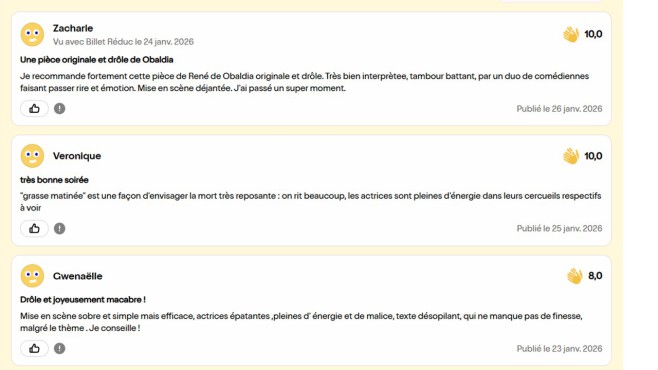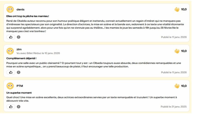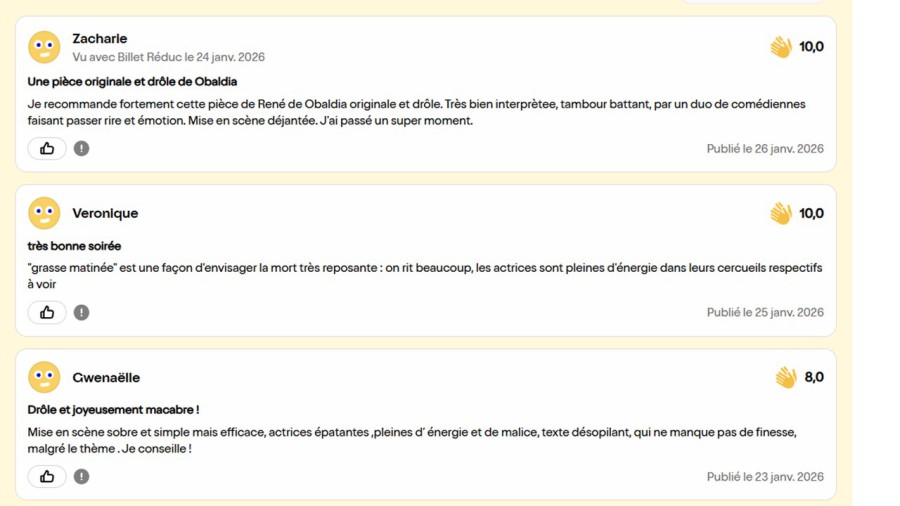 Ainsi va la vie chez les morts nous raconte René de Obaldia, cet auteur né à Hong Kong, fils d’un consul du Panama et qui a grandi entre Amiens et Paris avant de passer toute la guerre prisonnier dans un stalag. Obaldia a connu son premier succès grâce à Jean Vilar avec Le Satyre de la Villette avant d’être repéré par André Barsacq dan son théâtre de l’Atelier. L’auteur devait faire triompher son humour doux-amer avec Du vent dans les branches de Sassafras, un énorme succès. Entré à l’Académie française, il sera le second Académicien centenaire et mourra à l’âge de 103 ans en 2022. Son œuvre théâtrale est publiée en sept volumes chez Grasset. Grasse mâtinée figure dans le dernier volume. On découvre cette petite pièce grâce à Corine Richard et Monique Vérité qui en sont les formidables interprètes et merci à Christian Canot de mettre tout cela en rythme.